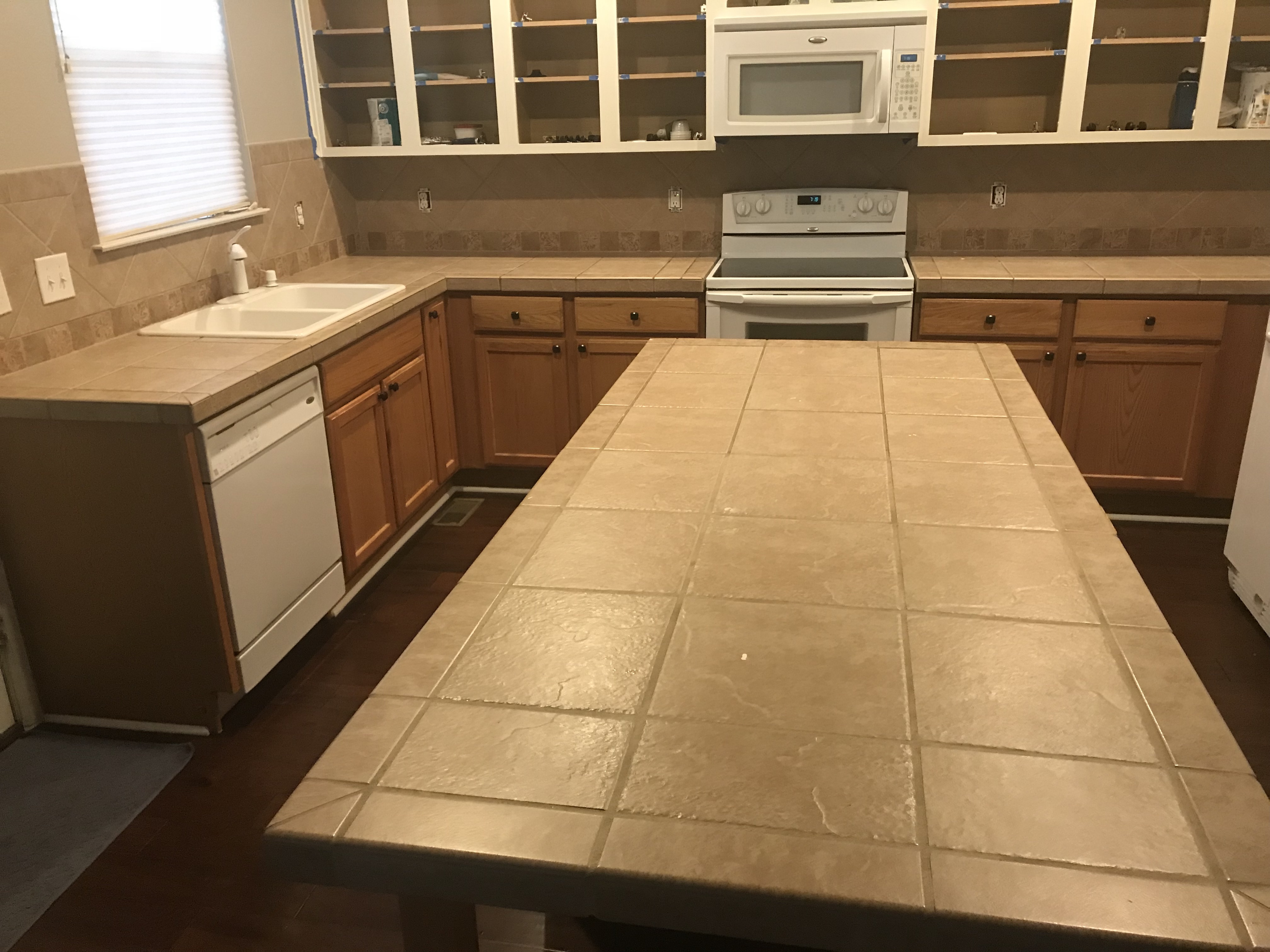 When we moved in, the countertops were beige tile. Basically, the owner before us bought the house from the builder and took the base options for pretty much everything. The result? A beige, oak cabinet kitchen. That’s not really our jam, so we are painting the cabinets white (Yikes! What a pain!) and having the tile countertop replaced with granite.